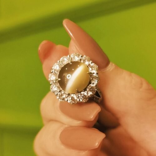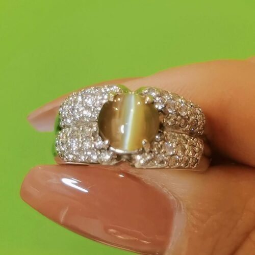 Honey Cats Eye Ring – 7ct Chrysoberyl Diamond Lace Design