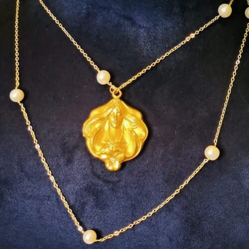 Art Nouveau Mucha Goddess Locket Necklace – 1940s Vintage Style (Pearl Station Chain)
