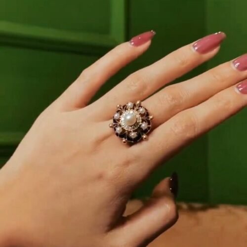 Victorian Blue Enamel & Wild Pearl Ring – 1880s 15k Gold Antique (Diamond Accents)