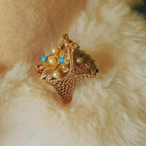 Victorian “Giardinetto” Flower Basket Brooch – 1860s 18k Gold (Ruby & Turquoise)