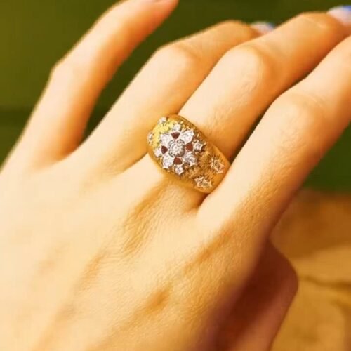 Florentine Finish Diamond Flower Ring – 18k Gold “Silk” Engraving (Buccellati Style)
