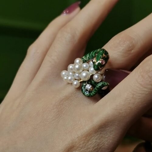 Vintage Green Enamel Serpent Ring – 18k Gold & Akoya Pearls (c. 1940s)