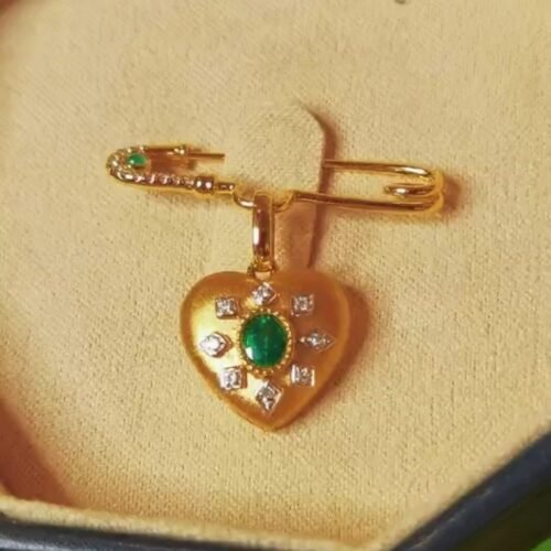 18k Gold Emerald Heart Safety Pin Brooch – Diamond Accents (Trendy Style)