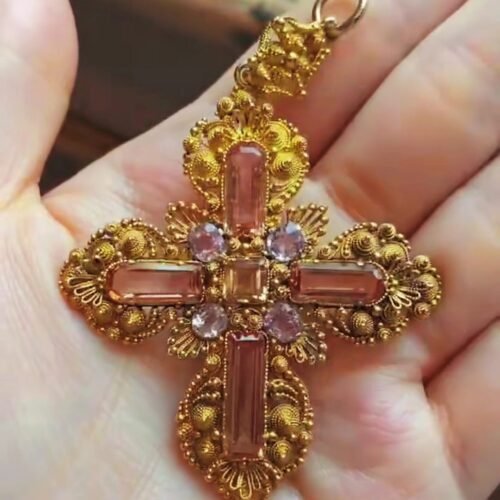 Georgian Pink Topaz Cross Pendant – c. 1830s Cannetille Gold (Museum Grade)