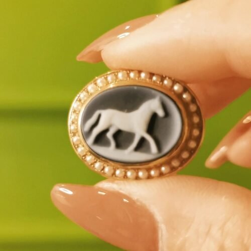 German Agate Cameo Pendant – Hand Carved White Horse (18k Gold & Seed Pearls)